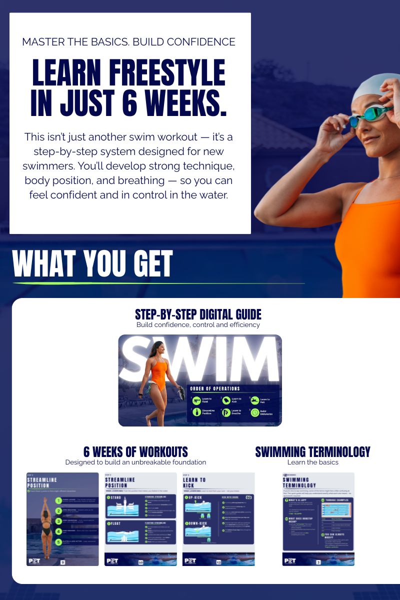 This isn’t just a collection of drills. It’s a complete roadmap to help you master the essential skills that fuel real progress — with weekly workouts, graphic demonstrations and a clear path to confidence in the pool.